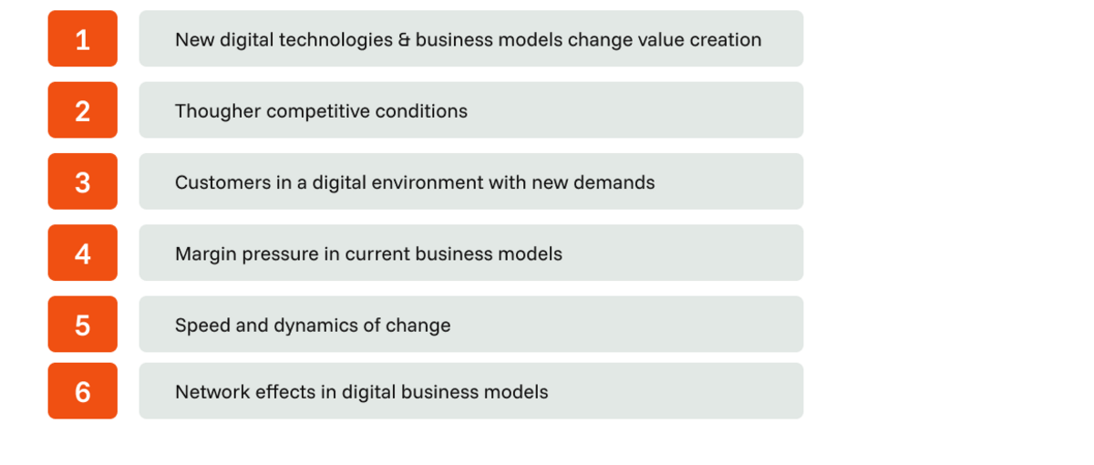 What tends to bring home the need for change, however, is often the same: economic pressure. Within a VUCA world (Volatility, Uncertainty, Complexity, Ambiguity), organizations find their growth hitting the buffers. “Digitized” customers with new, individual requirements, wishes and ideas constitute an abrupt acid test for the value creation and competitiveness of companies. At the same time, these changes become ever-faster and more dynamic, underlining how crucial it is for managers to shape the digital transformation successfully. Driving the implementation forward are emerging digital technologies like the Internet of Things (IoT), artificial intelligence (AI), human-machine and machine-to-machine communication and big data.