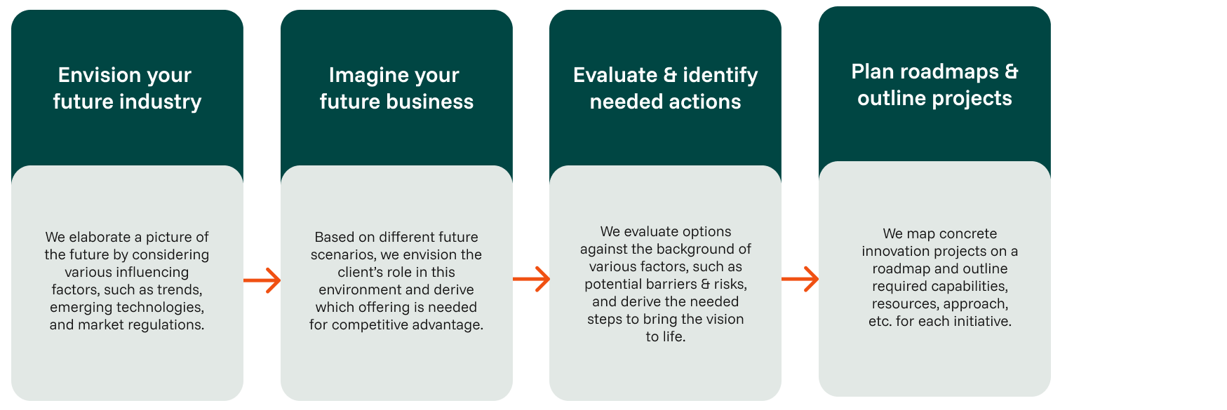 Strategic Foresight liefert Unternehmen die notwendigen Erkenntnisse und Informationen für die Gestaltung ihrer Innovationsstrategie. Das erlaubt ihnen nicht nur, auf die aktuellen Herausforderungen zu reagieren, sondern positioniert sie auch als Branchenführer in der Zukunft. Unser ganzheitlicher Innovationsberatungsansatz basiert auf Strategic Foresight. Damit setzen wir Konzepte in die Realität um und füllen sie langfristig mit Leben. Gemeinsam gestalten wir Ihr zukünftiges Geschäft strategisch – indem wir die richtige Innovationsstrategie definieren, maßgeschneiderte Methoden und Werkzeuge finden und Innovation zu einem integralen Bestandteil Ihrer Unternehmens-DNA machen.