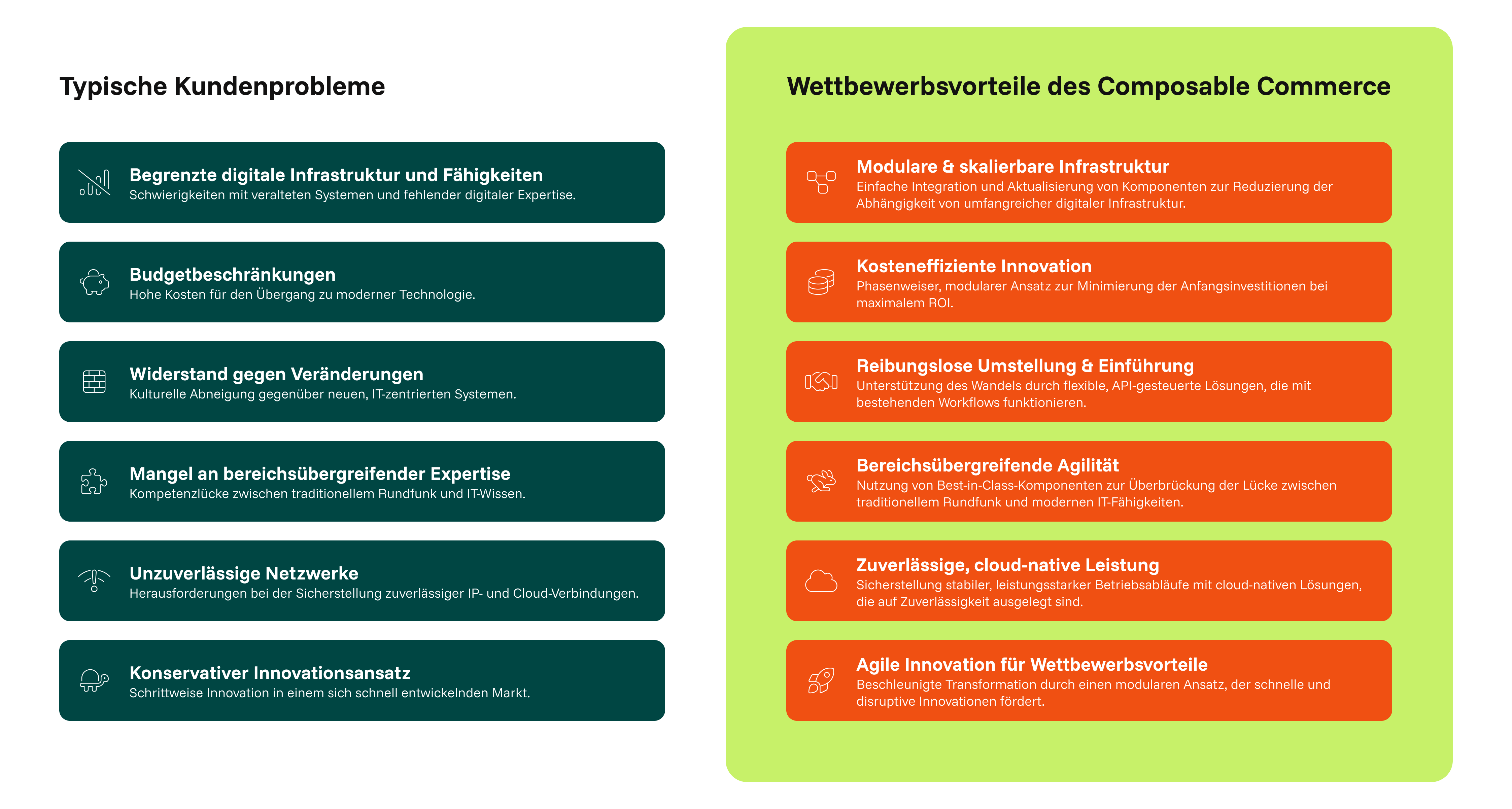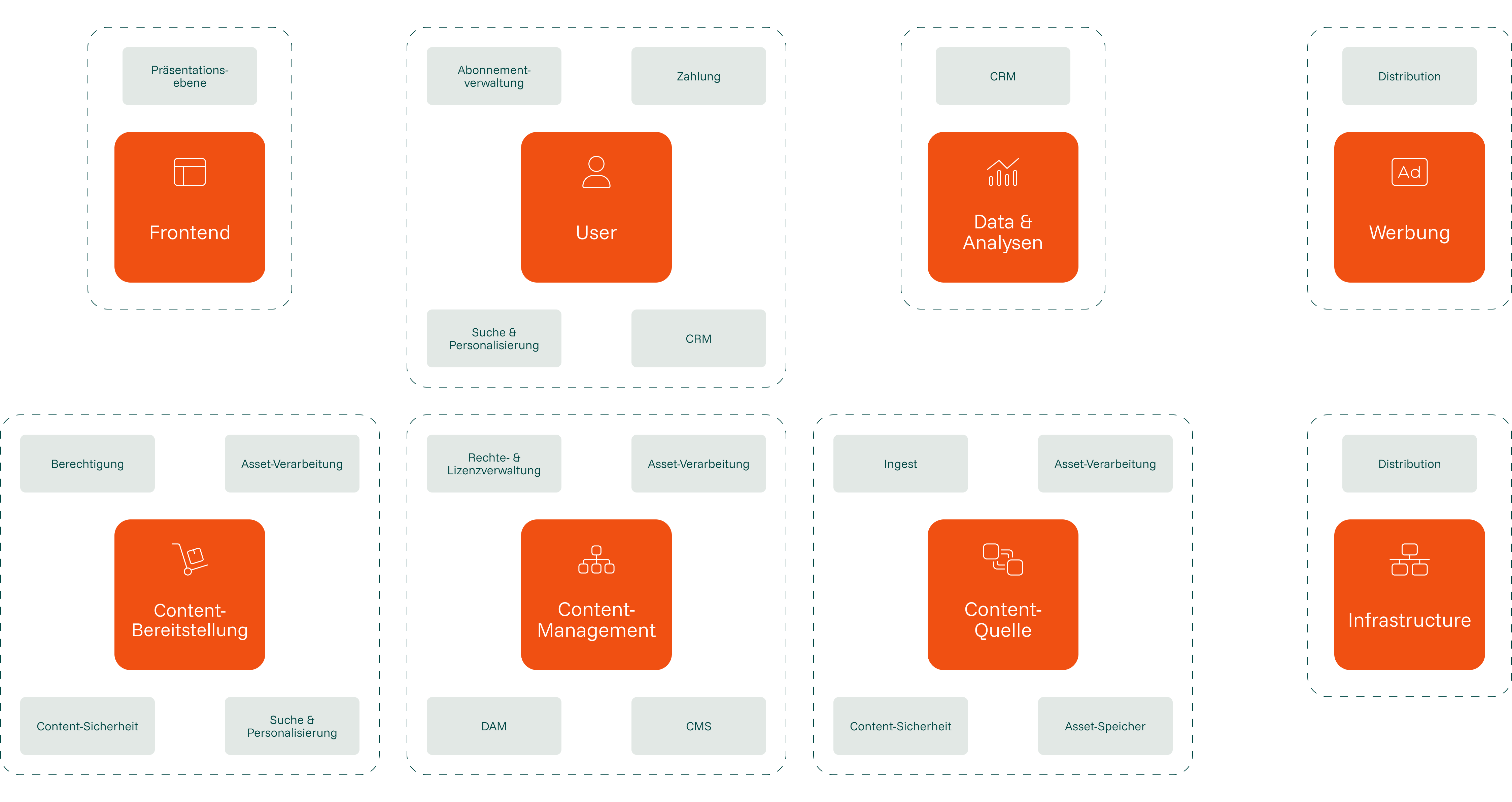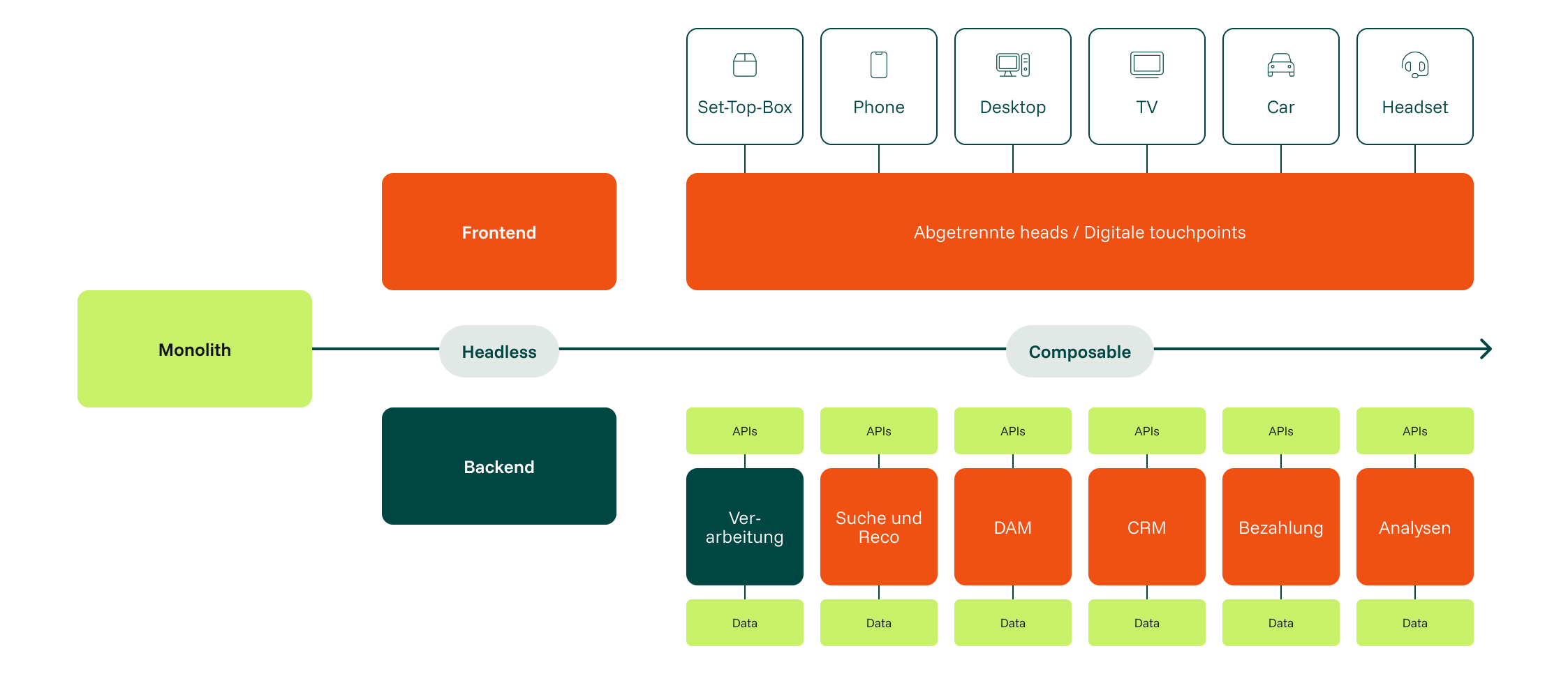 Composable OTT ist ein modularer, cloudnativer Ansatz, der eine hochgradig anpassbare, zukunftssichere und skalierbare Streaming-Plattform mit KI-gestützten Workflows ermöglicht. Durch die Integration eines Best-of-Breed-Technologie-Stacks können Unternehmen schnell auf neue Trends reagieren, Funktionen schneller bereitstellen, personalisierte Nutzererlebnisse bieten, die Zuschauendenzufriedenheit durch KI-gesteuerte Empfehlungen erhöhen und eine nahtlose Monetarisierung erreichen - und das alles ohne Vendor-Lock-in.
