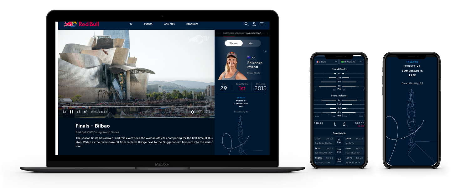 Die Engagement-Sidebar hebt die Besonderheiten von Sportarten wie Cliffdiving, Mountainbiking oder Surfen auf redbull.tv hervor. Gleichzeitig erhalten die Zuschauer:innen leichter Zugang und tauchen regelrecht in die Events ein.