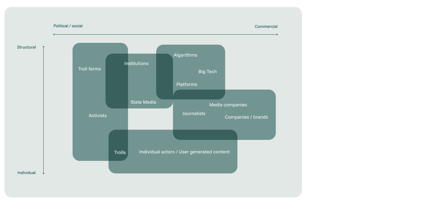 Es bilden sich neue und komplexe Gruppierungen, auf die nicht allgemeingültig und pauschal reagiert werden kann. Individuelle und institutionelle Akteure bewegen sich in einem Raum, in dem sowohl kommerzielle als auch politisch-gesellschaftliche Interessen relevant sind. Um den Überblick über die verschiedenen Strömungen und Akteure zu behalten, ist eine exakte Medienanalyse unerlässlich.