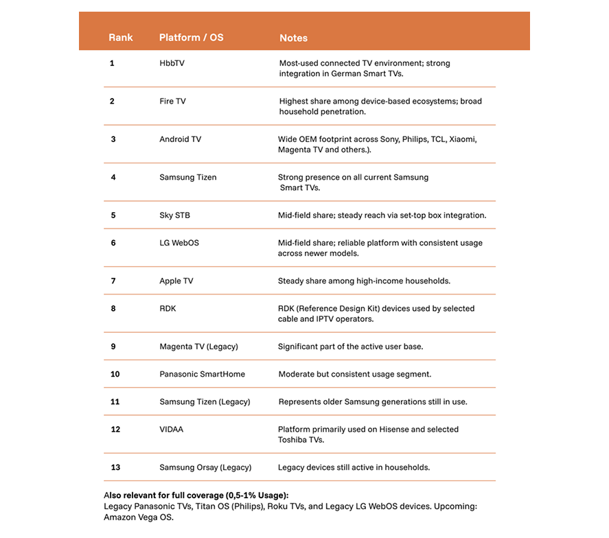 HbbTV und Amazon Fire TV führen die Liste als zentrale Einstiegspunkte an. Danach folgen Android TV, Samsung Tizen und ältere HbbTV Versionen. LG WebOS und Sky liegen im Mittelfeld. Apple TV, Magenta TV Altsysteme und Panasonic SmartHome erreichen ebenfalls relevante Nutzung. Auch ältere Samsung Geräte und neuere Plattformen wie VIDAA erzeugen weiterhin konstanten Traffic.