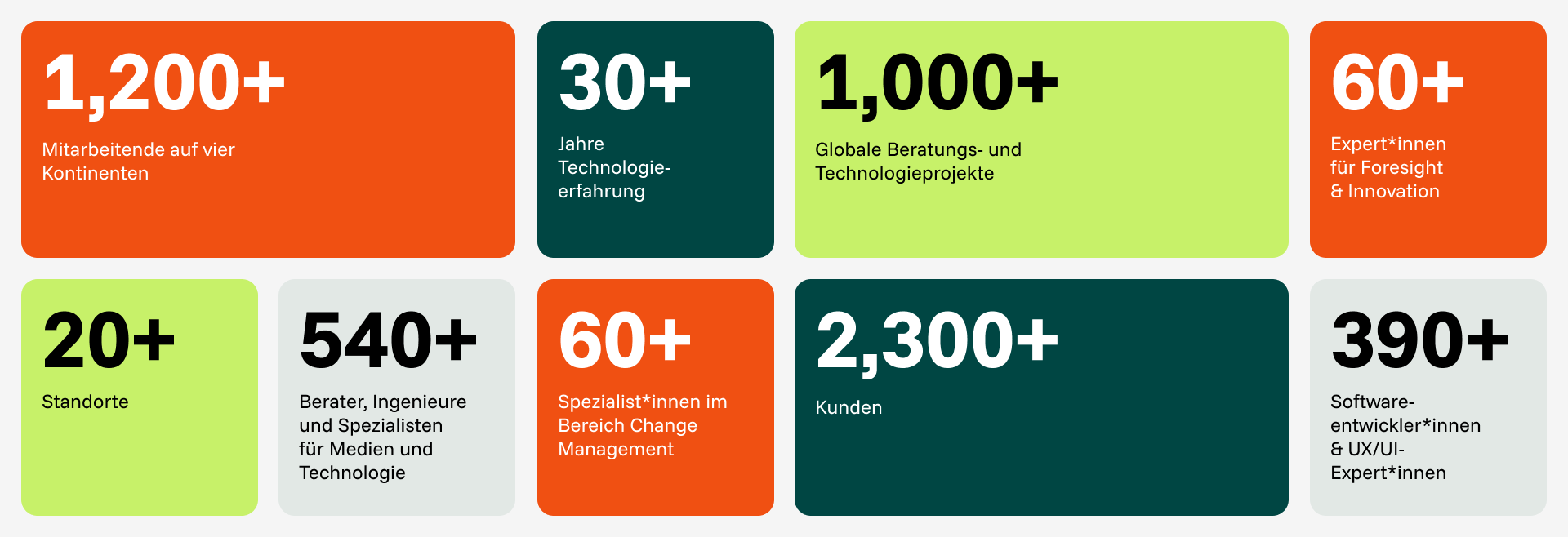 Dafür arbeiten wir mit weltweit führenden Marken aus Branchen zusammen, in denen Technologie den Fortschritt bestimmt – von Medien und Unterhaltung über Gesundheitswesen, Mobilität und Konsumgüter bis hin zum öffentlichen Sektor. An unseren internationalen Standorten in Europa, den USA, dem Nahen Osten, Südostasien und Australien erwarten dich vielfältige Karrieremöglichkeiten.
