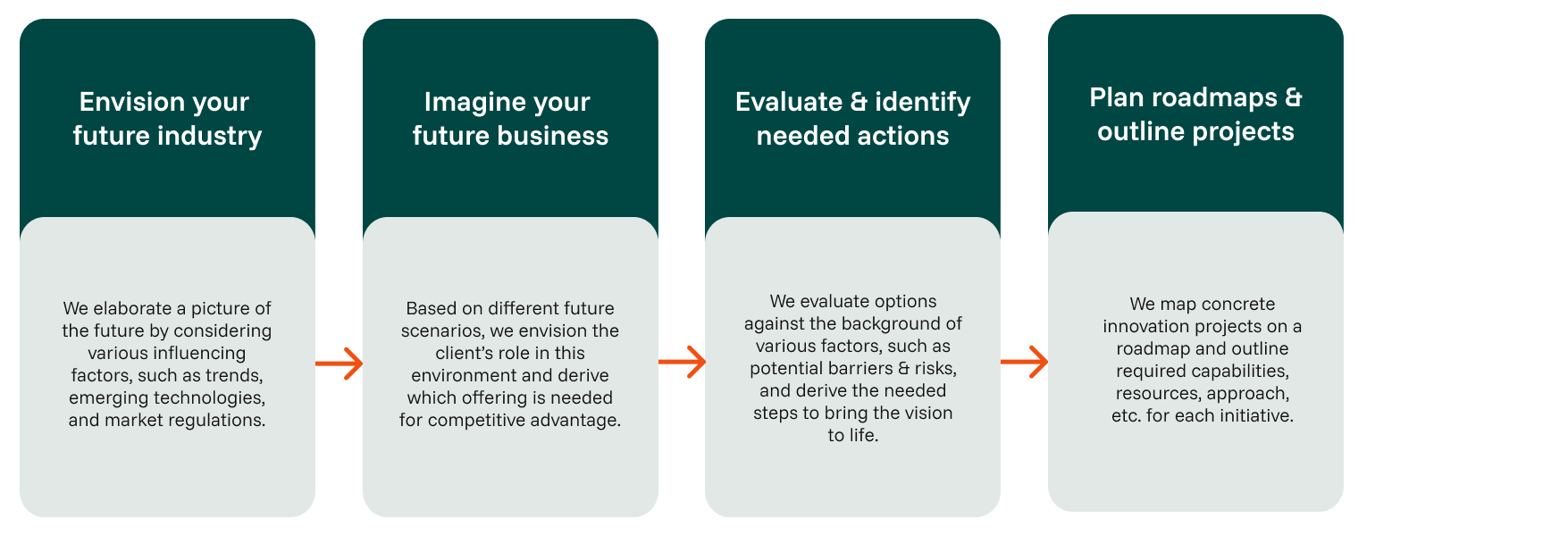 Strategic Foresight provides companies with the insights and information they need to shape their innovation strategy. This not only allows them to respond to current challenges, but also positions them as industry leaders in the future. Our holistic innovation consulting approach is based on Strategic Foresight. This enables us to turn concepts into reality and bring them to life in the long term. Together, we strategically shape your future business - by defining the right innovation strategy, finding customized methods and tools and making innovation an integral part of your corporate DNA.