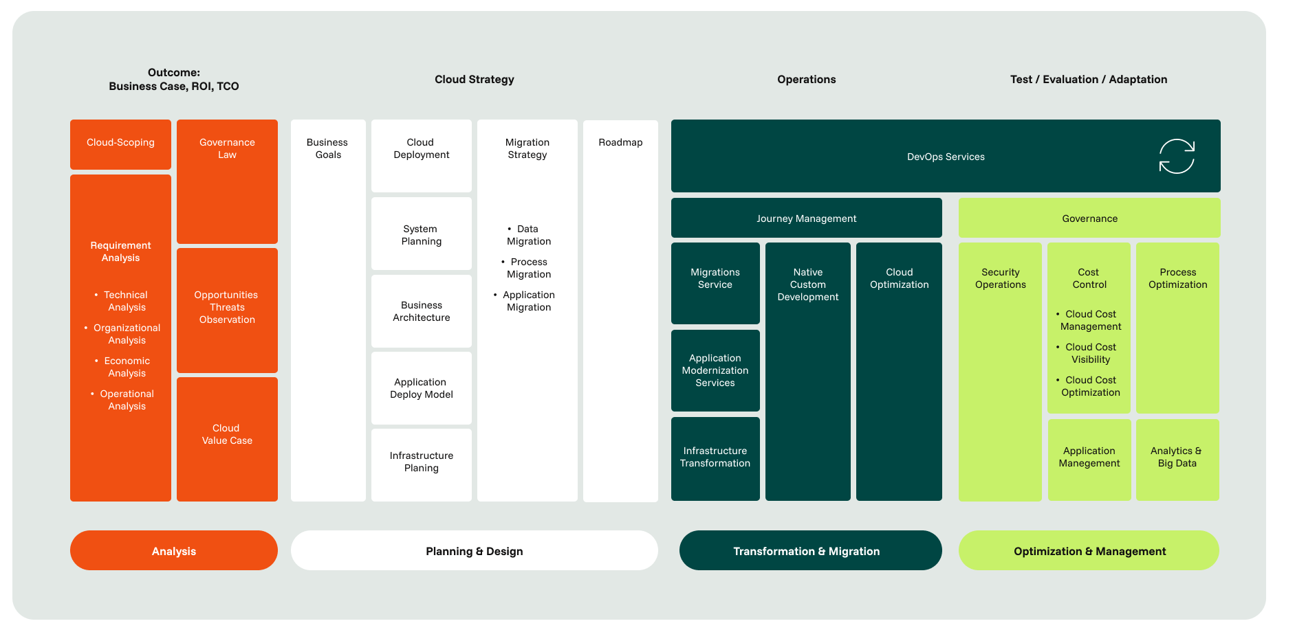 The framework is based on individual services that initiate, analyze, design, execute, migrate and optimize a cloud transformation. To understand a transformation means a complete re-evaluation and revision of a company’s information technology to improve efficiency and delivery in a digital economy.