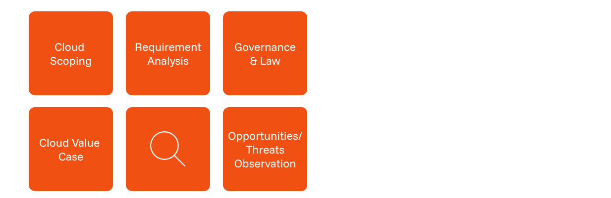 First, we start with the development of a rough Cloud Scoping, based on the customer’s intentions and business strategies. Afterwards we gather the necessary information, specifications and requirements through business, economic, technical and operational analysis. From these we can derive the relevant opportunities and threats and make them available for future consideration. In addition, we need to understand and integrate the company’s security strategy, policies and local law, and perform opportunity and threat assessment to create a Cloud Value Case.