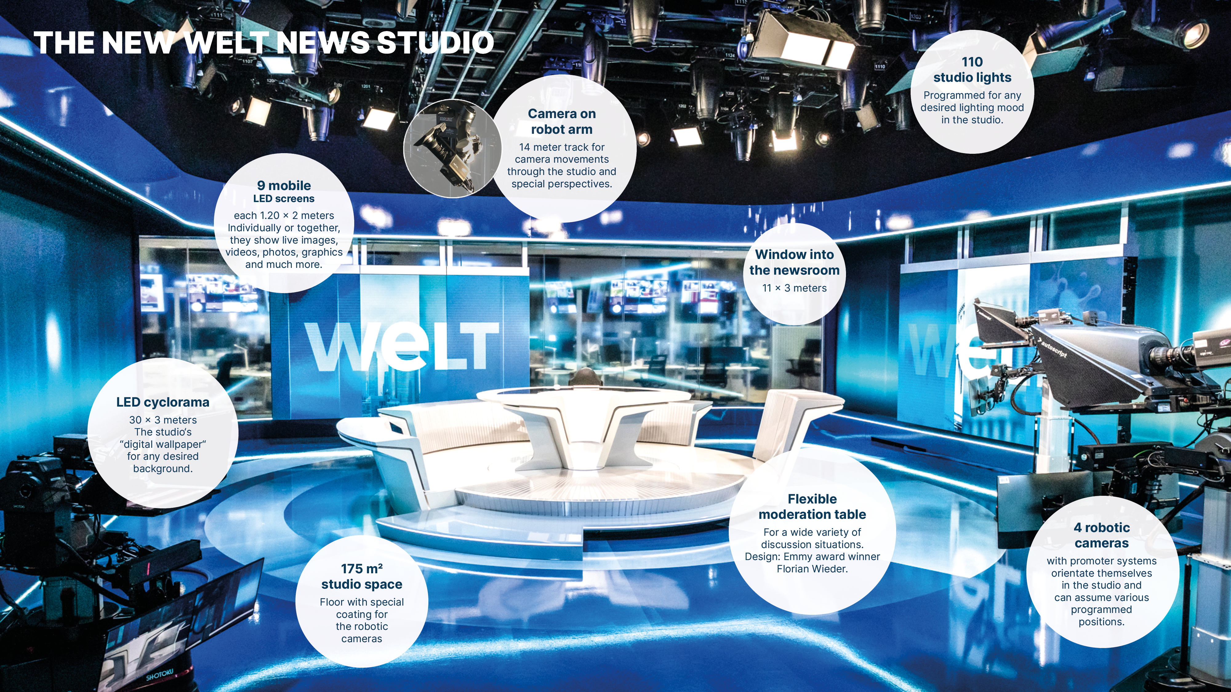 With the successful transition to IP, WELT has replaced a broadcasting technology that had developed over the years but had ultimately become outdated. The result has been the creation of one of the most innovative news channel platforms. All the elements are perfectly tailored to one another: the network architecture, the IP-based connections, the mixerless workflow, the IP-based light, the autonomous tracking shots, performances in the studios in various directions, the LED walls that can be moved (even during live operation), and the full-screen LED cyclorama in the background. According to Norman Tettenborn: “The technical components are also designed to harmonize with one another even in the future – for example, after any expansions. This is already relevant for the integration of the new studio for BILD Live. Production is scheduled to begin here in 2022.”