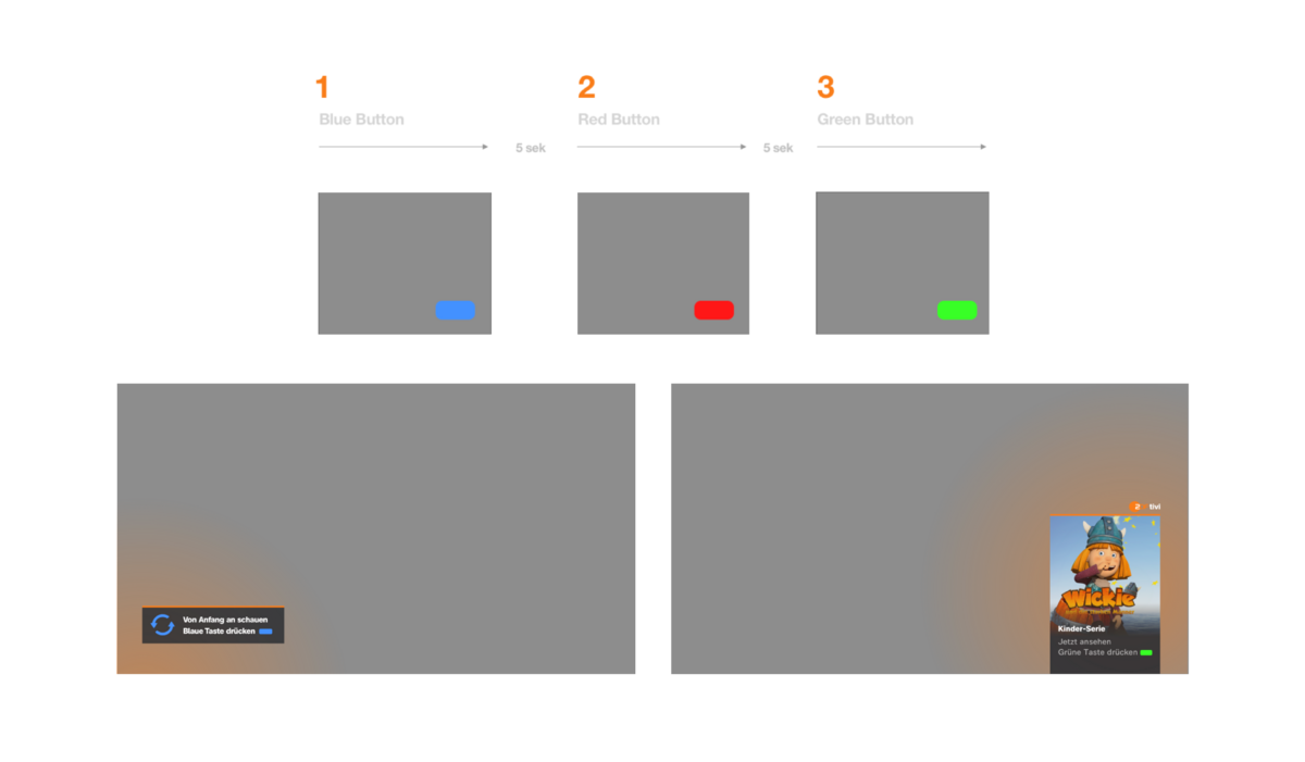 The start screen of the broadcasters’ HbbTV apps offers features like restart, content apps, and recommendations. In surveys, ZDF viewers said they struggle to process the information in the short time available. They mainly use the menu to access Catch-Up TV and ignore content recommendations. Graphics and texts are often poorly structured for this use case.