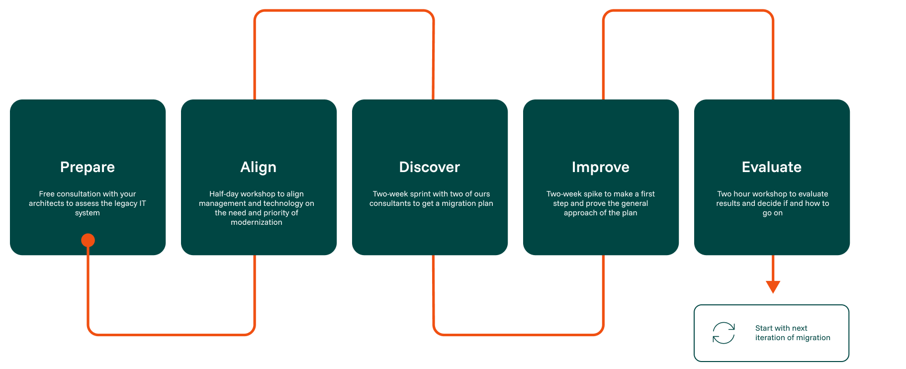 In 5 steps spanning about two months we guide you to finding the right way to migrate your legacy IT system.